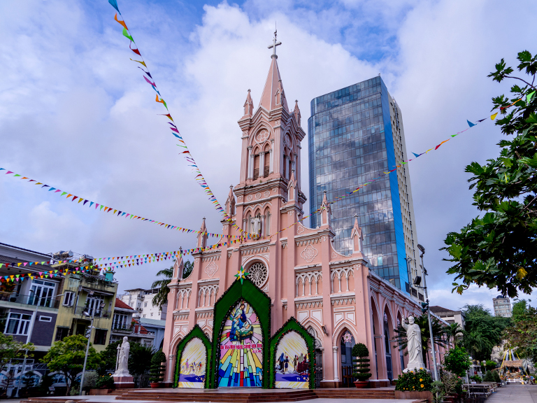 Da Nang Cathedral is the city’s most iconic Catholic landmark, instantly recognizable for its pastel-pink façade and Gothic-inspired design (pointed arches, tall bell tower, and stained-glass style elements). It’s often nicknamed the “Rooster Church” because there is a rooster-shaped weathercock at the top of the tower, a detail locals commonly point out when explaining the church’s identity and symbolism.