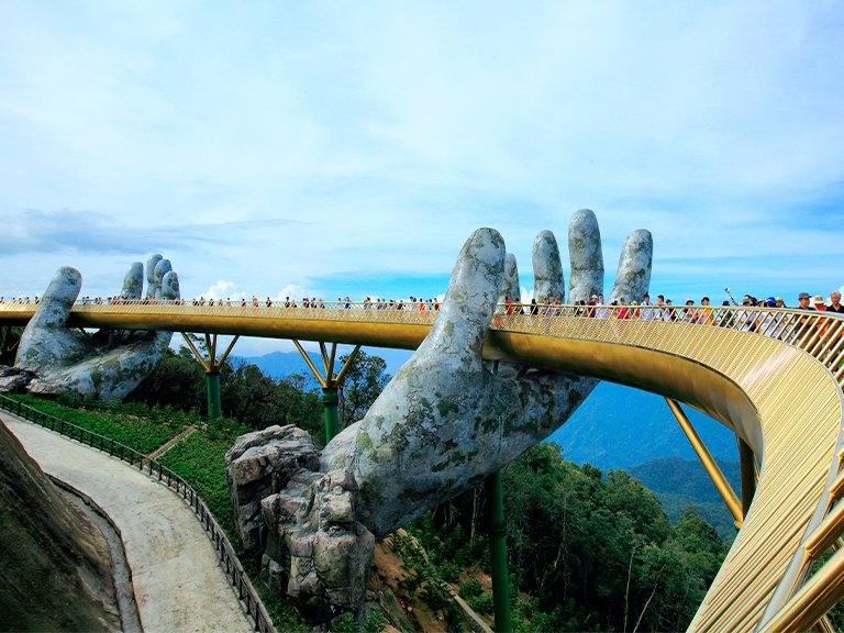 The Golden Bridge is the headline attraction: a 150-meter pedestrian bridge famous for the “giant hands” supporting it. It was officially introduced/inaugurated in June 2018 as part of the Sun World Ba Na Hills complex. Sun World also describes its role as a scenic connector between areas/stations within the complex, emphasizing it as a “new tourism product” that quickly gained worldwide media attention.